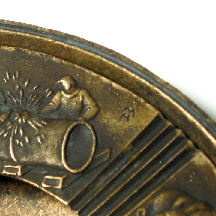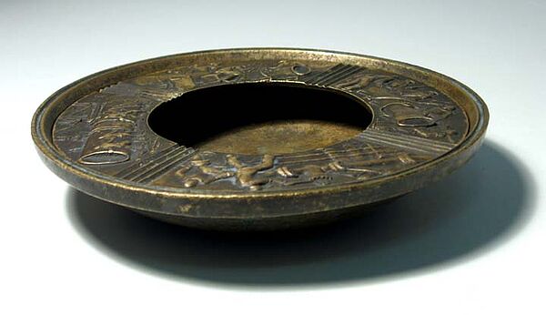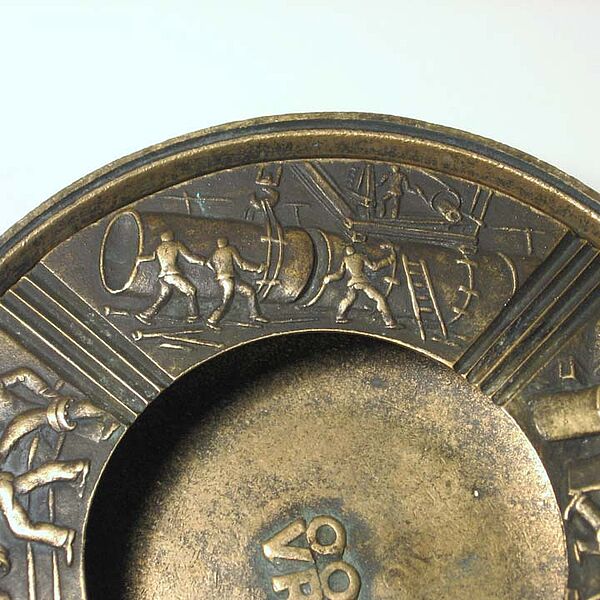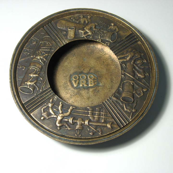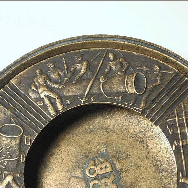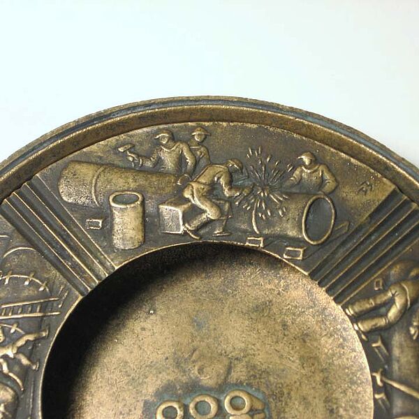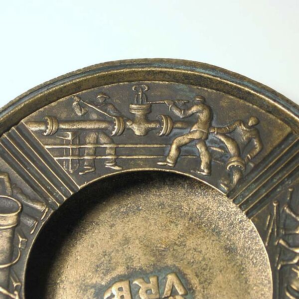 Schüsselförmiger, schwerer Bronzekorpus mit abnehmbarer Scheibe, die zentral eine runde Öffnung und oberseitig vier Reliefs mit Darstellungen von Arbeitern beim Schweißen, Verschrauben, Transportieren bzw. Verlegen von Rohren aufweist. Am Bodengrund bezeichnet mit "VRB" (evtl. volkseigener Rohrbau-Betrieb o.ä.). Durchmesser ca. 17 cm, Höhe ca. 3,5 cm, ungeputzter Zustand mit Patina und Gebrauchsspuren. Im Randbereich monogrammiert "MH" (= Heinrich Moshage), wohl Deutschland der 50er Jahre.