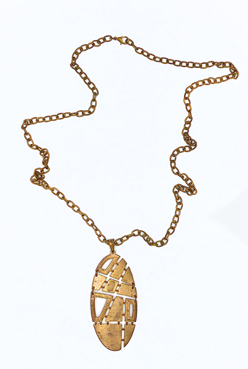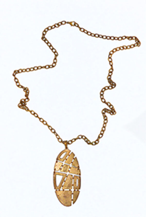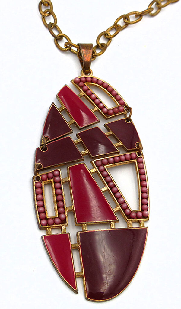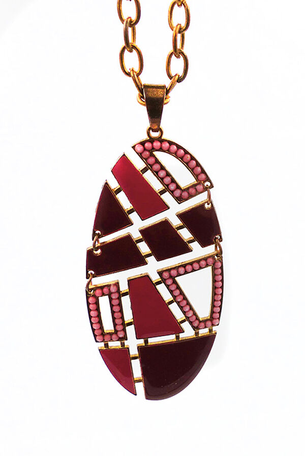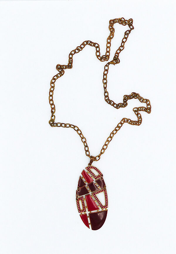 In der Grundform hochovaler, aus verschieden geformten Segmenten zusammengesetzter Anhängerkorpus. Die Segmente sind teilweise offen gearbeitet , z.T. mit kleinen Ringen beweglich, z.T. mit kleinen Stegen starr verbundenen und vorderseitig abwechselnd wein- bzw. dunkelbraunrot emailliert sowie partiell mit kleinen, perlförmigen Elementen besetzt. Oberseitig einfache, bewegliche, kupferne Anhängeröse. Hierzu kupferne Ankerkette mit Ringösenverschluß und einer Länge von 36 cm, der Anhänger hat eine Länge von ca. 8 cm. Geringe Patina, minimale Tragespuren. Wohl 1950er Jahre. der vorderseitig Kettenlänge, ca.36cm