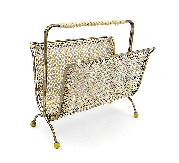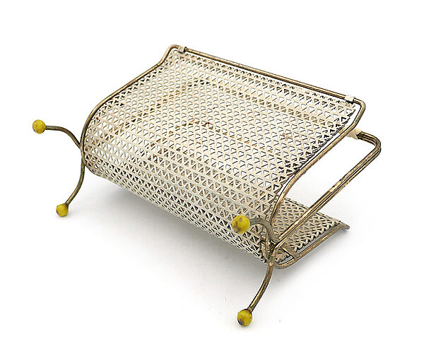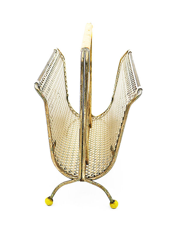Korpus und Messing und beige-farbenem Kunststoff, der die klassische Form eines Zeitungsständers en miniature. Maße ca. 13,5 x 13 x 8 cm, leichte Patina und moderate Altersspuren. Wohl Deutschland der der 1950er Jahre.