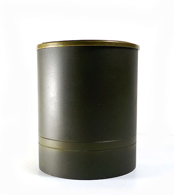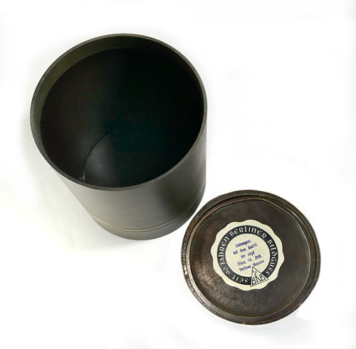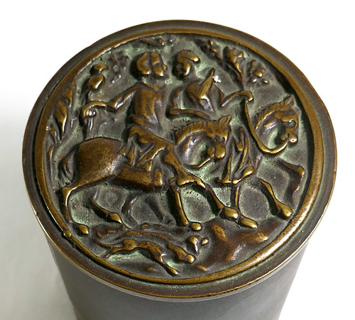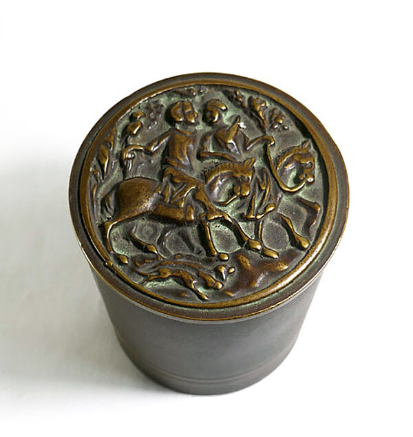 Zylindrischer, braun patinierter Bronzekorpus. Die Deckeloberseite ziert die Nachbildung eines historischen Reliefs, welches leicht stilisiert ein Reiterpaar in vegetabiler Umgebung zeigt, der vordere Reiter hält einen Falken auf dem Arm, am unteren Rand kann man zwei Jagdhunde erkennen. Auf der Deckelinnenseite befindet sich ein Aufkleber mit folgender Bezeichnung: "Seit 90 Jahren Berliner Bildguss - Liebespaar auf dem Ausritt zur Jagd - franz. 14. Jhdt. Berliner Museen". Höhe ca. 10 cm, Durchmesser ca. 8,5 cm, moderate Patina, geringe Gebrauchsspuren. Wohl 1960er, 70er Jahre