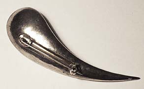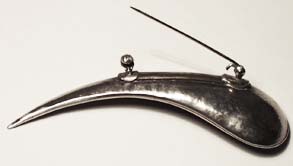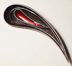 Der schweifartige, konkav gewölbte Silberkorpus (835er) weist innen zwei die Grundform jeweils verkleinert wiedergebende Stege auf, wobei der innere in seiner Krümmung gegenläufig und mit roter Emaille ausgefüllt ist. Länge ca. 8 cm, ungeputzter Zustand mit vorderseitig relativ dunkler Patina, diskrete Gebrauchsspuren. Rückseitig Sicherheitsbroschierung mit Kugelkopf. Ungemarkt, wohl Deutschland der 1950er, 60er Jahre.