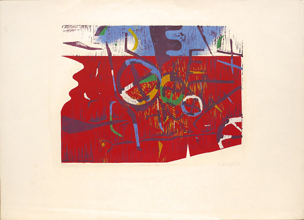 Farbholzschnitt auf chamoistonigem Papier, unter der Darstellung mit Bleistift betitelt, signiert und datiert (19)"56", Handabzug. Druckstockmaße ca. 51 x 38 cm, Blattmaße ca. 79,5 x 57 cm, geringe Alrers-, Griff- und Lagerspuren: zwei kleine Einrisse rechts unten, die breiten weißen Ränder sind teilweise leichte Knickspuren auf, minimal wasserrandig, fleckig und gebräunt.