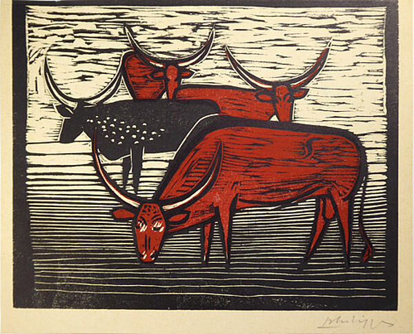 Farblinolschnitt: ohne Titel (Watussi-Rinder-Herde)