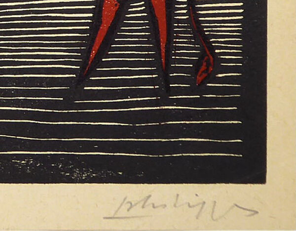 Farblinolschnitt auf chamoistonigem Papier, rechts unterhalb der Darstellung mit Bleistift handsigniert "Philipp" (leider bisher keinem konkreten Künstler zugeordnet). Von Blattmaße ca. 27 x 21 cm, geringe Alters-, Griff- und Lagerspuren. Wohl 1950er, 60er Jahre.