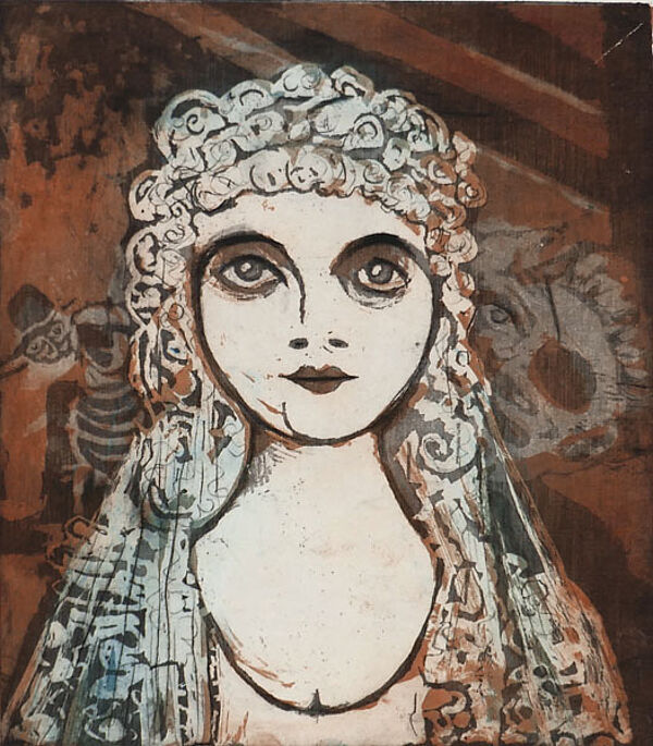 Farblithografie: "Drei Groschenoper "Polly" Köpfe aus Brechts Dramen"
