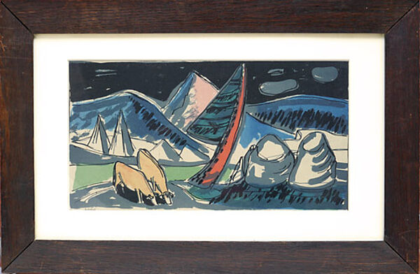 Farblithografie: o.T. (Gebirgslandschaft mit Schafen)