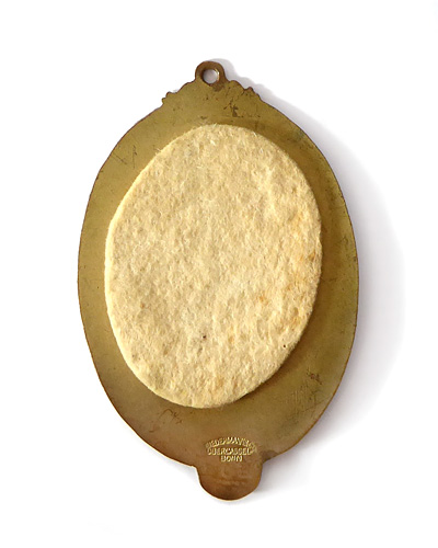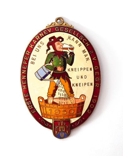 Hochovaler, vorderseitig polychrom emaillierter Messingkorpus. Entlang des Randes bezeichnet "ERSTE HENNEFER KARNEV. GESELLSCHAFT e.V. GEGR. 1902", im Feld ist ein Harlekin dargestellt, der mit hochgekrempelten Beinen in einem Holzbottich steht, in einem Arm eine Gießkanne haltend, über die Wasser in den Bottich läuft, in der anderen Hand hält er ein Bierglas aus welchem er trinkt, zudem hier bezeichnet "BEI UNS KANN MAN KNEIPPEN UND KNEIPEN" sowie "1950". Am unteren Rand ist das Hennefer Wappen aufgesetzt, oberseitig starre Aufhängeöse. Maße ca. 8 x 5,3 cm, geringe Altersspure. Rückseitig geprägte Markung "Biedermann & Co., Obercassel-Bonn".
