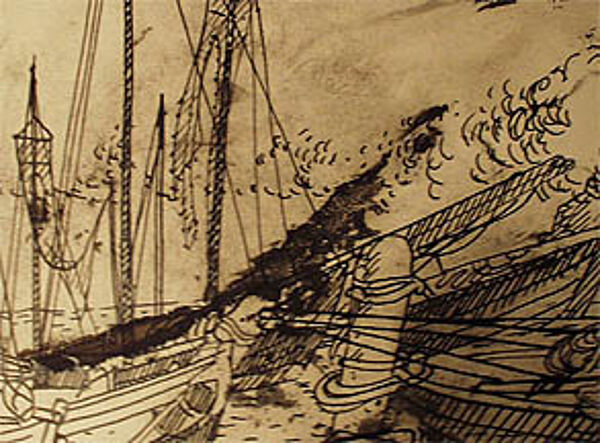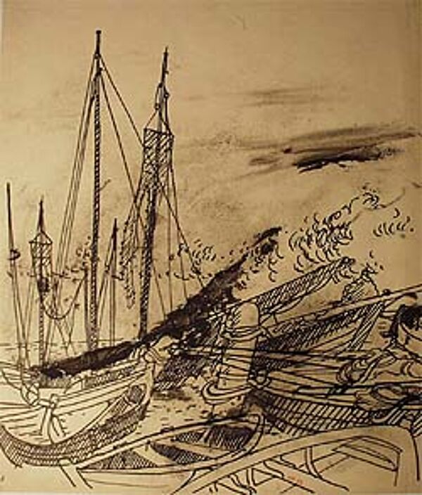 Feder-/Tuschezeichnung, z.T. laviert. Boote am Strand oder im Hafen (das Blatt ist zwar unbezeichnet, vermutlich handelt es sich hier aber um ein Hiddensee'er Motiv, siehe ähnliche Arbeit aus dieser Zeit in "Otto Müller" - Ausstellungskatalog der Staatlichen Galerie Moritzbug in Halle von 1963). Maße ca. 30 cm x 25 cm. Blatt minimal unfrisch, rückseitig Rest alter Montierung, insgesamt relativ guter Zustand. Unten mittig monogrammiert und datiert "1952" sowie rückseitig signiert.