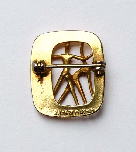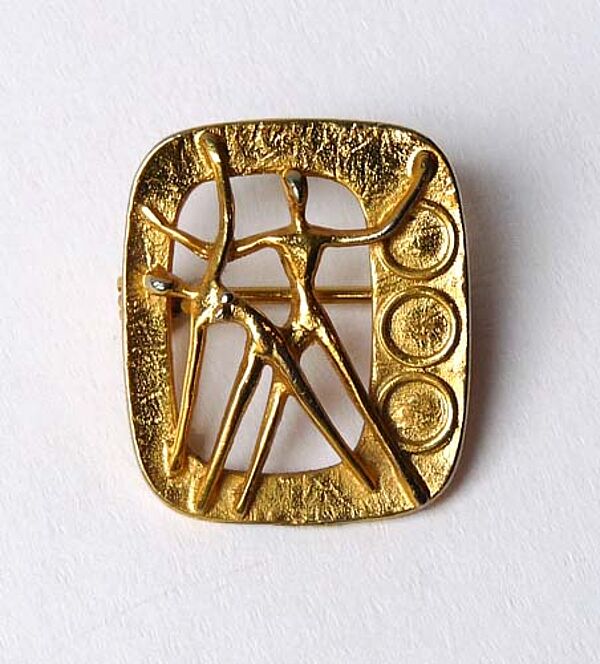 In der Grundform hoch-rechteckiger, zentral offener Korpus aus vergoldetem Metall mit abgerundeten Ecken, zentral vollplastisch ausgearbeitetes, stilisiertes Frauenpaar bei gymnastischen Übungen. Maße ca. 2,2 x 1,8 cm, minimale Tragespuren. Rückseitig Sicherheitsbroschierung mit Kugelkopf sowie Markung, wohl Ende der 50er, Anfang der 60er Jahre. Stilistisch ähnelt die Arbeit den Ballettbroschen, die um 1960 entstanden - siehe S. 48 in "AMATE - Der Goldschmied Herbert Zeitner", Verlag der Kunst 2010.