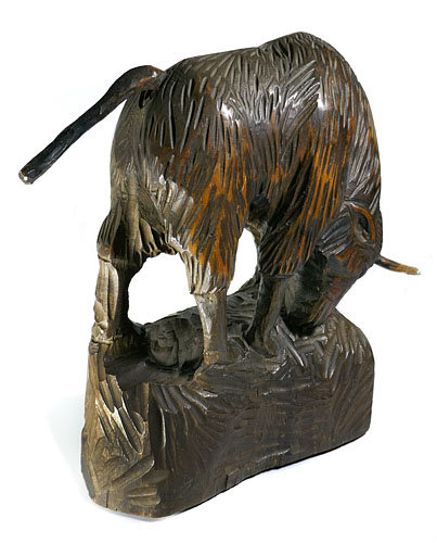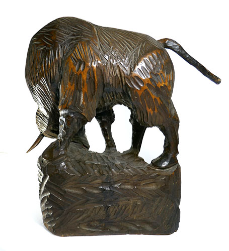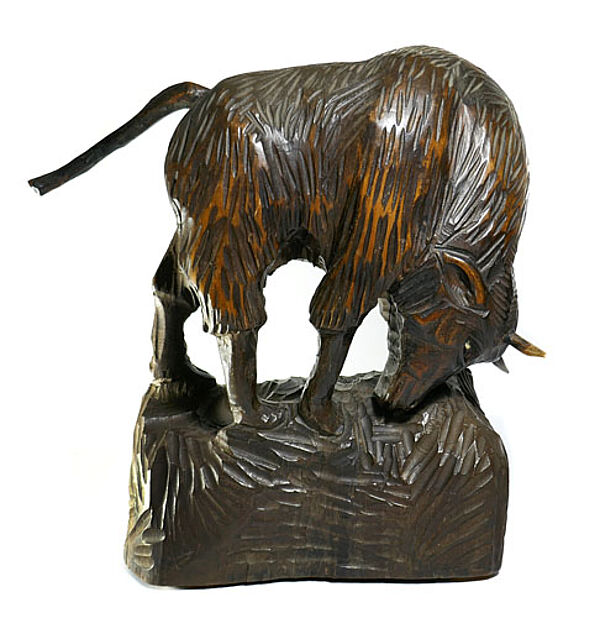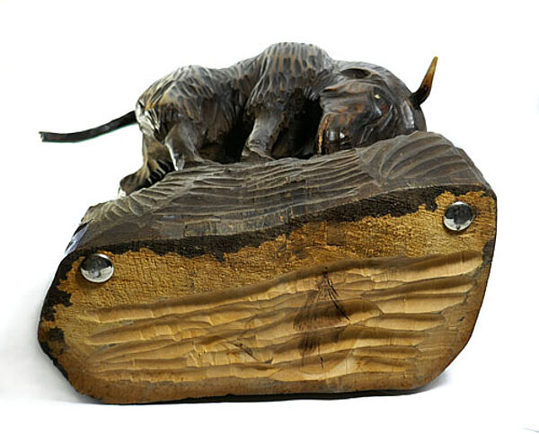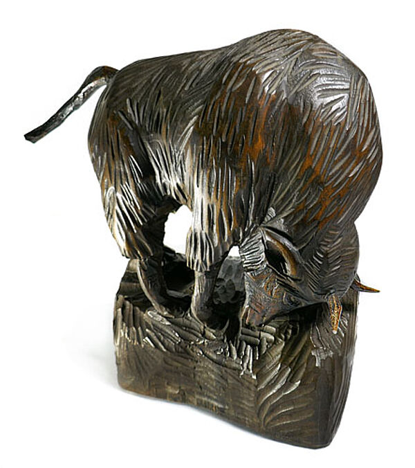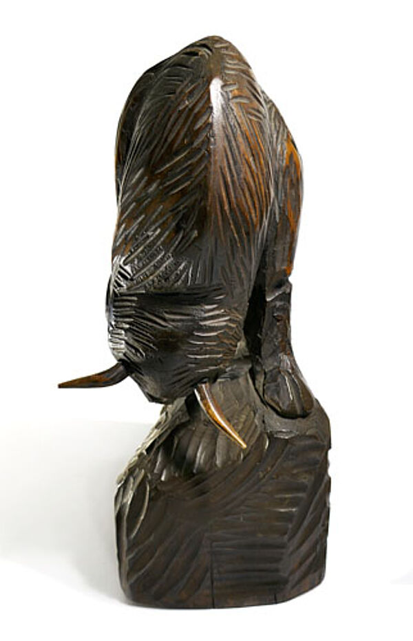 Expressiv-archaischer, en bloc geschnitzter, partiell braun gefasster Holzkorpus auf "natürlichem" Sockel. Maße ca. 35 x 18 cm, Höhe ca. 37 cm, geringe Altersspuren. Wohl 1960er bis 70ere Jahre. Unsigniert, evtl. Siegfried Rudolph Puchta (geb. 1933), kanadischer Bildhauer.