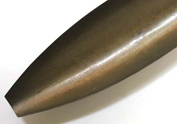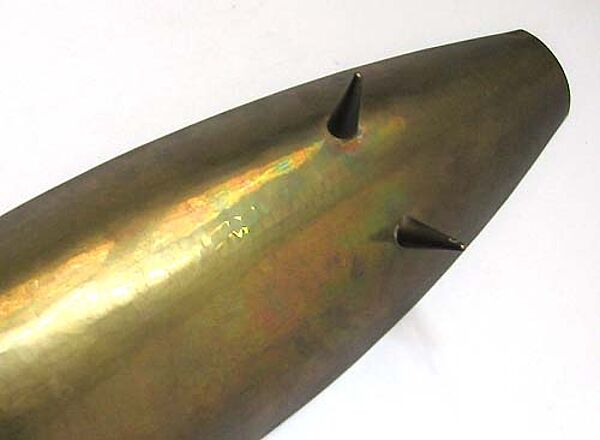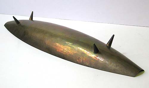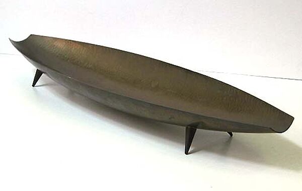 Der längliche, Schiff-förmige Korpus aus getriebenem Messing ruht auf vier spitz-kegelförmigen Füßen. Länge ca. 52 cm, Höhe ca. 5,5 cm, fast gleichmäßige Patina mit diskreten Gebrauchsspuren.
