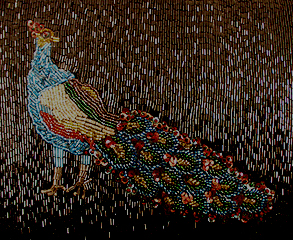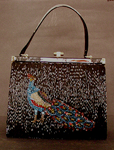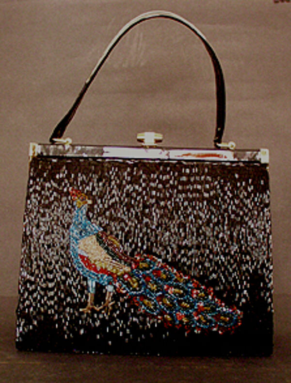 Annähernd rechteckiger Korpus aus schwarzem Lackkunstleder, zylindrische, vergoldete Messing-Handhabe des Federklipp-Verschlusses. Die Vorderseite weist ein aus verschiedenen Perlen (hand?)gesticktes Pfauenmotiv auf. Maße (ohne Henkel) ca. 28 x 23 cm. Geringe Alters- und Tragespuren. Wohl Deutschland der 1940er, 50er Jahre.