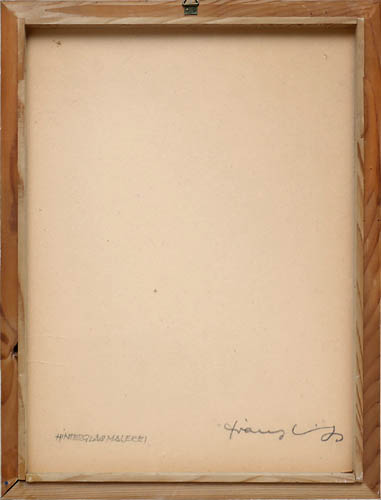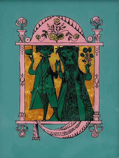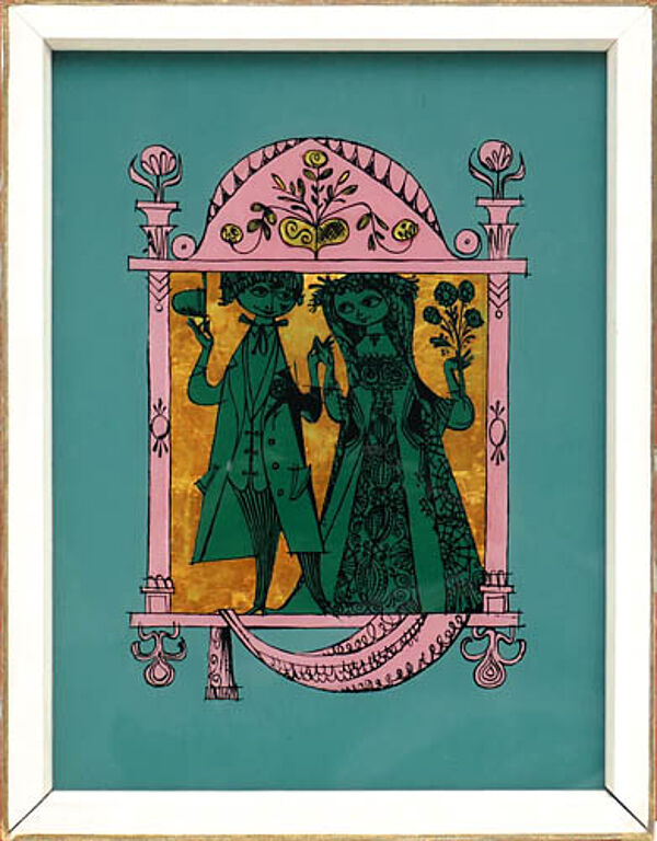 Hinterglasmalerei (in der Art an Björn Wiinblad oder Raymond Peynet erinnernd), rückseitig unleserlich signiert ("Franz ..."), originale Rahmung: überwiegend weiße, am äußeren Rand linienförmig gold abgesetzte Holzleiste mit den Außenmaßen von ca. 38,5 x 24,5 cm, geringe Altersspuren. Wohl 1950er Jahre.