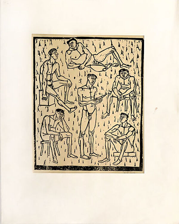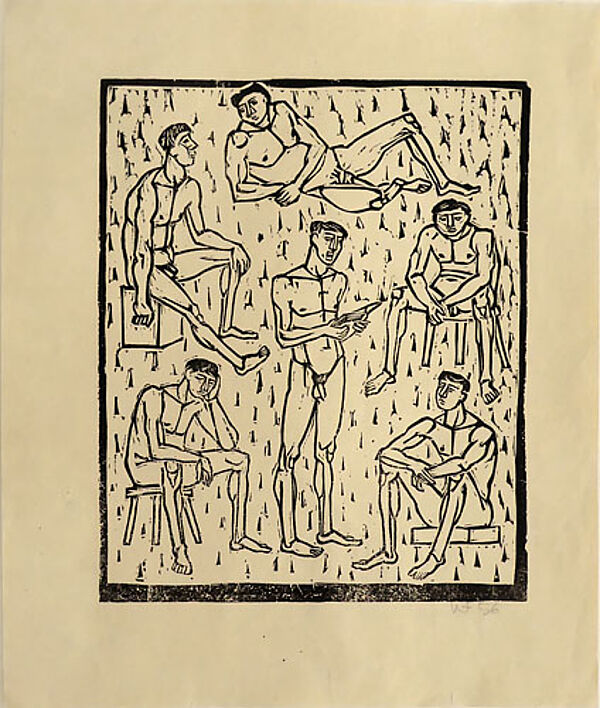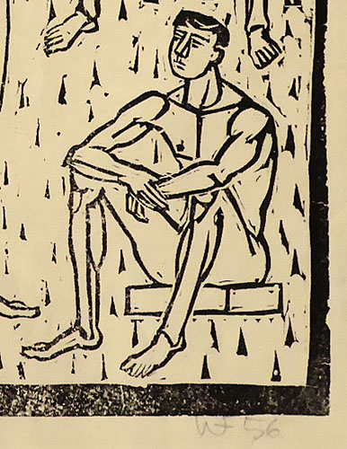 Holzschnitt auf chamoistonigem Papier (im Passepartout), rechts unterhalb der Darstellung mit Bleistift monogrammiert und datiert (19)"56". Blattmaße ca. 38,5 x 32 cm, Bildausschnitt im Passepartout ca. 29,5 x 23,5 cm, Passepartout ca. 47,5 x 37,5 cm, geringe Altersspuren.