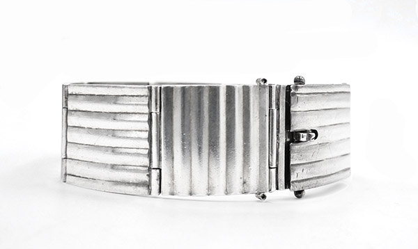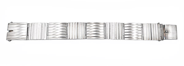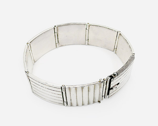 Das schwere, massiv silberne (935er) Armband besteht aus 8 rechteckigen Gliedern, die vorderseitig ein flach reliefiertes, abwechselnd quer und längs ausgerichtetes Streifenmuster aufweisen sowie untereinander jeweils mit einem scharnierten Gelenk verbunden sind. Breiter, zungenförmiger Federverschluss. Oberseitig sind an den beiden Enden winzige Ösen für ein Sicherheitskettchen angebracht (selbiges wurde aber entfernt). Länge des Armbands mit Schnappverschluss ca. 20,2 cm, Breite ca.2,1 cm, Durchmesser im geschlossenen Zustand ca. 6,5 cm, alt geputzter Zustand mit diskreter Patina und geringen Tragespuren.