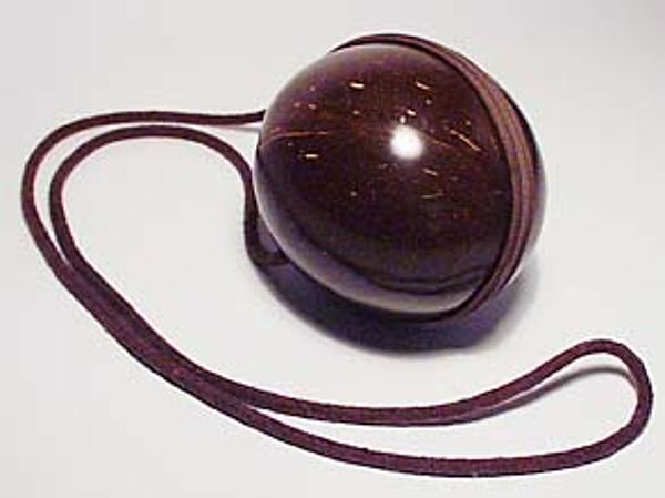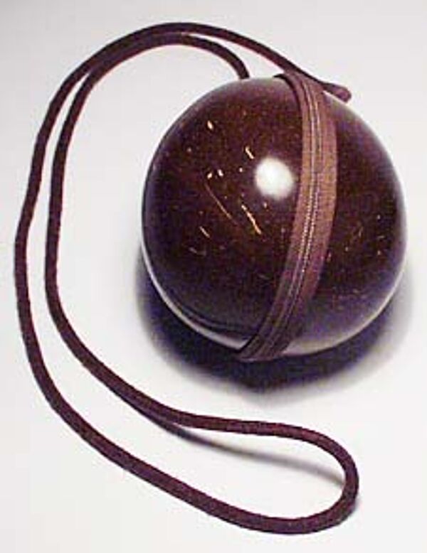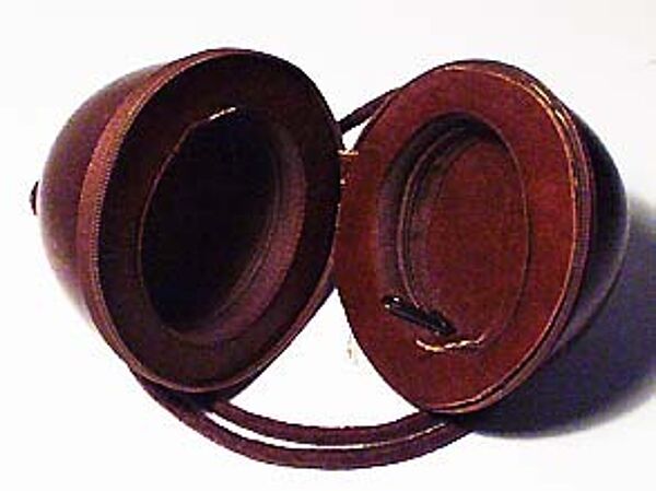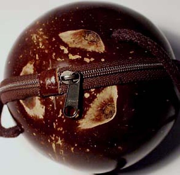Der Korpus der Tasche besteht aus den zwei Hälften einer polierten Kokosnuss (Durchmesser ca. 12 cm), verbunden mit einem Reißverschluss. Oberseitig ist eine dicke braune Schnur zum Umhängen befestigt (Länge ca. 115 cm). Das Innere ist mit Kunstleder ausgekleidet, hier ebenfalls Reißverschlüsse. Die Tasche dürfte aus den 40er / 50er Jahren stammen.
