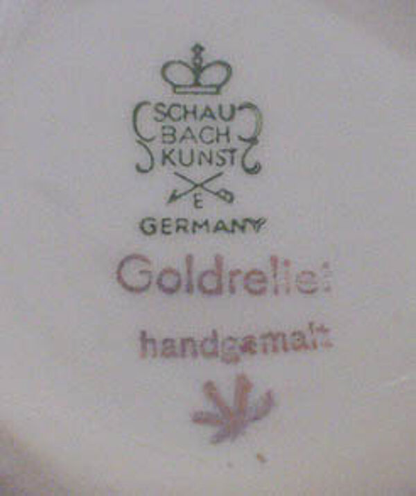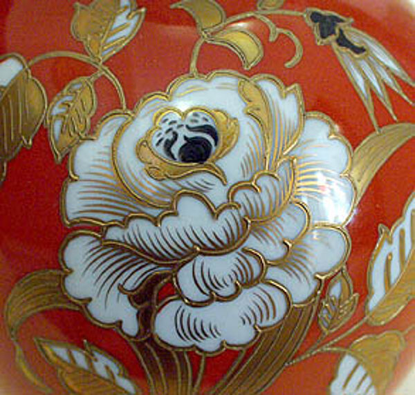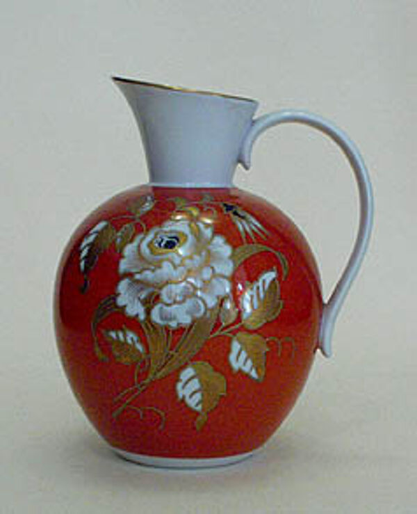 bauchige Form, ausgestellte und angeschrägte Mündung, rote Glasur mit floralem Goldrelief, H. ca. 17cm, gemarkt Schaubachkunst, 1950er