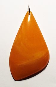 Korpus aus bernsteinfarbenem Kunststoff in asymmetrischer Tropfenform, kleine Silberöse. M.: ca. 7,2 x 3,8 cm. Wohl Deutschland um 1950.