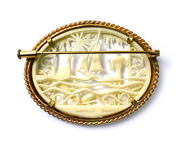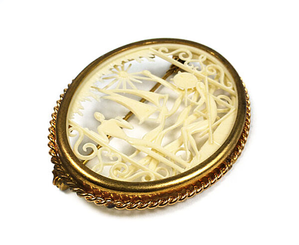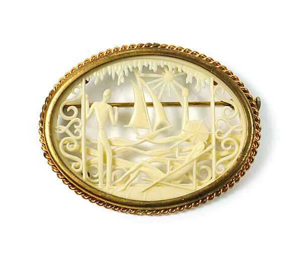 Querovaler vergoldeter Metall-, vermutlich Messingrahmen mit aufgesetztem Kordelband, der eine filigran-oppulente, leicht abstrahierte, humoristisch wirkende Strandszene aus elfenbeinfarbenem Kunststoff umschließt: ein stehender Mann und eine im Liegestuhl sitzende Frau mit Sonnenschirm unterhalten sich vor einer Meereskulisse mit Segelboot. Maße ca. 5,5 x 4,2 cm, geringe Patina und leichte Tragespuren. Rückseitig Sicherheitsbroschierung mit Hülsenkopf, zudem Bezeichnung "DEPOSE FRANCE", wohl 1930er bis 50er Jahre.