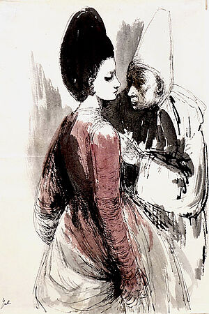 Aquarellierte Tuschezeichnung "Dame mit Bajazzo"