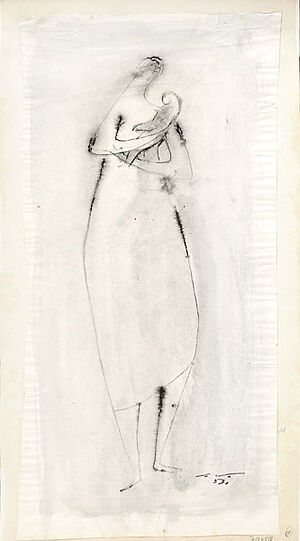 Lavierte Tuschfederzeichnung: ohne Titel (Stehende Mutter mit Kind) von 1953
