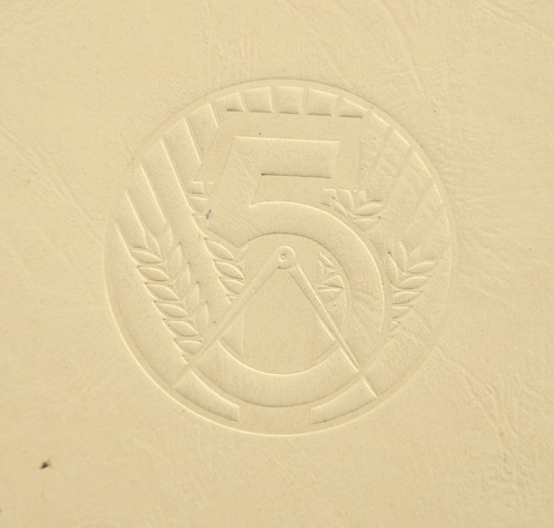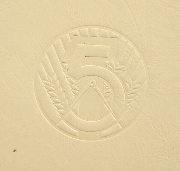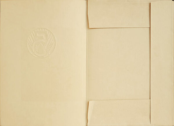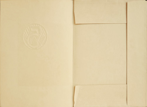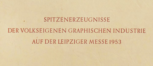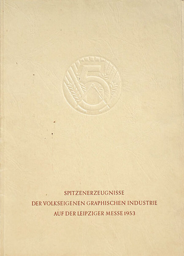 Klappmappe aus chamoistonigem, dünnem Karton, der vorderseitig das eingeprägte Emblem zum 5-Jahres-Plan der DDR und im unteren Drittel in weinroter Farbgebung den Aufdruck "SPITZENERZEUGNISSE DER VOLKSEIGENEN GRAPHISCHEN INDUSTRIE AUF DER LEIPZIGER MESSE 1953" trägt. Maße (zugeklappt) ca. 29,8 x 21,8 cm, geringe Altersspuren.