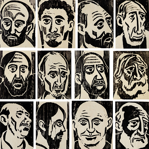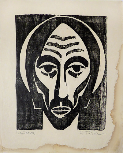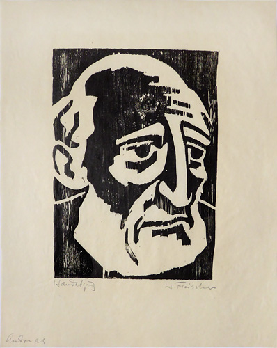 Mappe mit 13 Kopfstudien (und Deckblatt) zum Thema: "Christus und seine Jünger", dabei sind Andreas, Bartholomäus, Jakobus, Jakobus d. Jüng., Johannes, Judas, Mathäus, Petrus, Philippus, Simon, Thadäus und Thomas. Jeder Holzschnitt ist unter der Darstellung mit Bleistift handsigniert und bezeichnet. Blattmaße jeweils ca. 50 x 40 cm. Das Christusblatt ist im Randbereich, außerhalb der Darstellung, relativ deutlich wasserfleckig, die anderen Blätter mit nur geringen Alters-, Griff- und Lagerspuren. Die Holzschnittmappe entstand 1953/54.