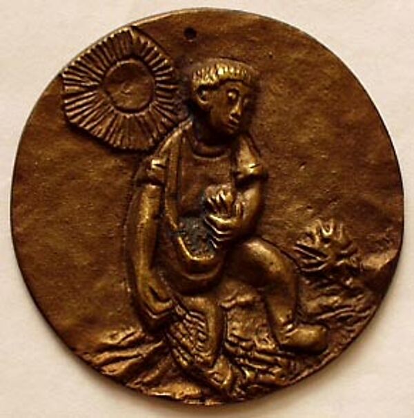 Expressiv gestaltetes Flachrelieff eines säenden Bauern, Messing, D. ca. 48 mm, kleine Verfärbung oder umschriebene Oxydation (im Tuch des Bauern), wohl 40er / 60er Jahre.