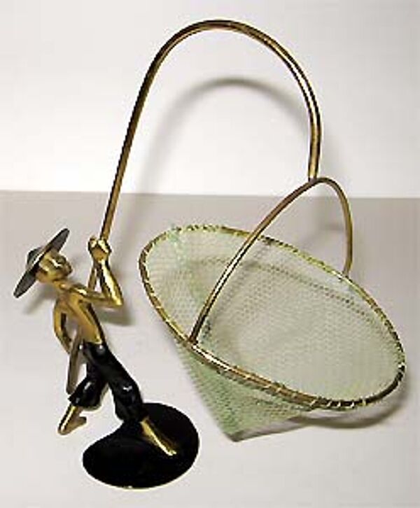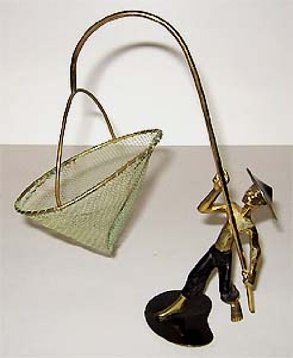 Messingfigur eines chinesischen Fischers, der ein Netz (geflochten aus feinen, grünen Fäden) einholt. Zum Teil polierte, z.T. schwarz lackierte Oberfläche (Hose, Sockelplatte, Hut). Gesamthöhe ca. 17 cm, Höhe der Figur ca. 9 cm. Geringe Gebrauchsspuren. Ungemarkt, wohl Hagenauer oder andere Wiener Metallwarenfabrikation der 50er Jahre.
