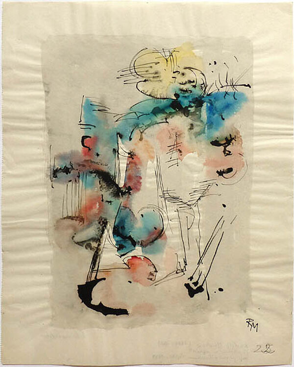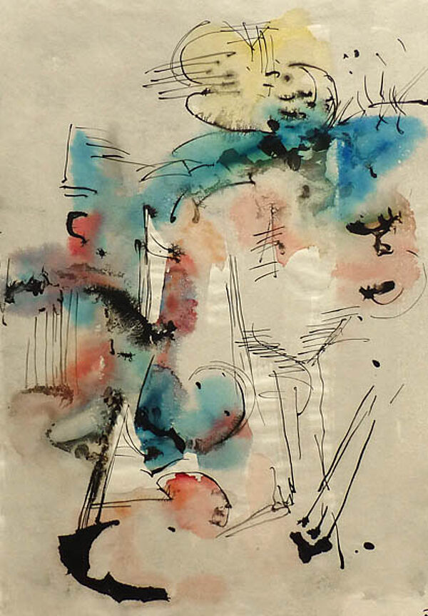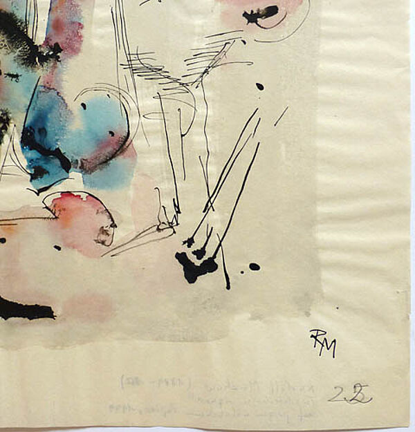 Aquarell und Tuschfeder auf pergaminähnlichem Papier, rechts unten monogrammiert, rückseitig betitelt. Hier zudem von fremder Hand bezeichnet, u.a. auch datiert "1949". Blattmaße ca. 32,3 x 35,8 cm, geringe Alters-, Griff- und Lagerspuren, an der Unterseite zwei kleiner hinterklebte Einrisse. Im Randbereich leichte Wellungen des Papiers, dies werkimmanent. Typische Arbeit des Informel.