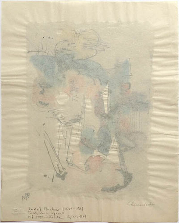 zu Rudolf Muchow, deutscher Zeichner und Maler; geboren und gestorben in Freiburg im Breisgau; Muchow war mit Willi Baumeister befreundet; er studierte an der Kunstakademie Kassel und war Professor für Bildende Kunst an der Akademie Frankfurt a.M., später dann in Stettin; nach anfänglicher vom Expressionismus beeinflusst, später von der Neuen Sachlichkeit; nach Entzug des Professoren-Titels durch die Nationalsozialisten zunehmend ironisch-karikaturistische Zeichnung; ab 1946 abstrakte-phantastische Graphik in Nähe zu Baumeister und Wols (Informel); in den 1950er Jahren Vertreter des Expressiven Realismus; Werke des Künstlers sind u.a. im Museum für Neue Kunst in Freiburg im Breisgau. Lit.: Katalog Rudolf Muchow, Freiburg 1972.
