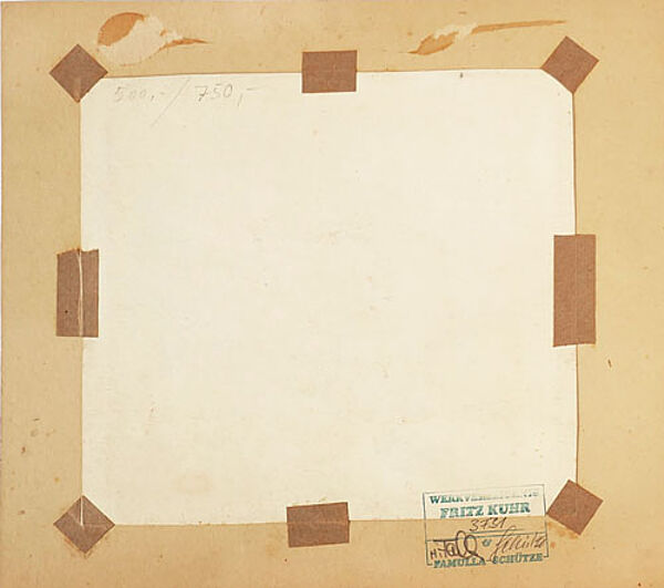 Mischtechnik auf Papier, hinter altem, wohl originalem Passepartout, an diesem rückseitig mit 8 kleinen Klebestreifen fixiert, siehe Foto. Blattmaße ca. 20,5 x 19 cm, Passepartoutmaße ca. 28 x 25 cm, die Arbeit selbst weist nur geringe, das Passepartout etwas deutlichere Alters-, Griff- und Lagerspuren auf. Unsigniert, rückseitig Werkverzeichnis-Stempel mit handschriftlichem Eintrag der WVZ-Nr. "3731" sowie Unterschriften der beiden Nachlassverwalter Famulla und Schütze. Wohl 1940er, 50er Jahre.