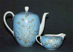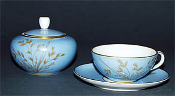 Hell- bzw. taubenblaues, 15-teiliges, dünnwandiges Porzellan-Service mit goldenem, zeittypischen Gräserdekor. Maße: Höhe der Kanne ca. 14,5 cm, der Zuckerdose ca. 7,5 cm, des Milchkännchens ca. 5,5 cm, der Tasse ca. 3,5 cm (Durchmesser 7,5 cm). Durchmesser des Tellers ca. 11,5 cm. Minimale Gebrauchsspuren, nicht oder kaum benutzt. Unterseitig gemarkt, Marke zwischen 1950 und 1954 in Gebrauch.