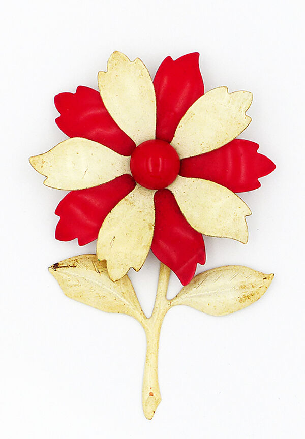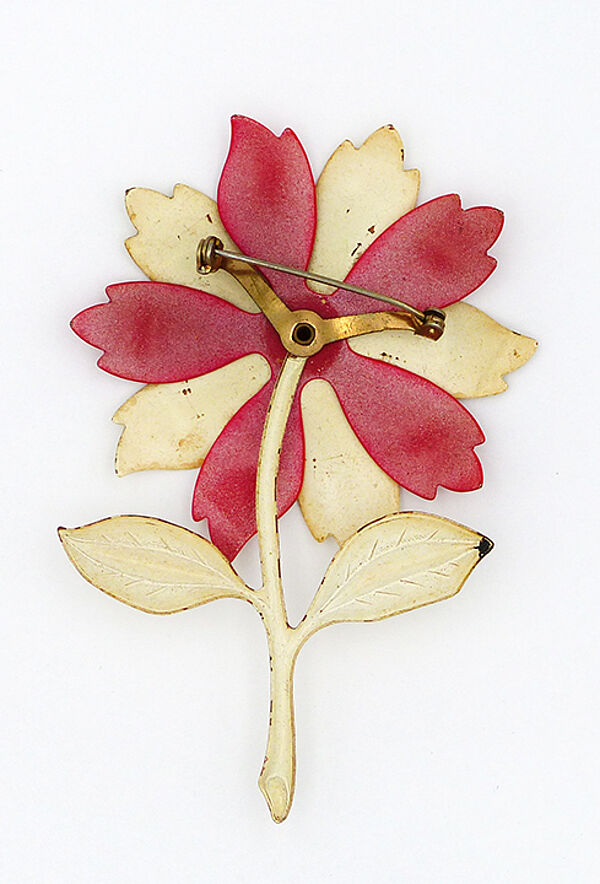 Halbplastisch angelegter Korpus in Form einer leicht stilisierten Blume, der sich aus ausgeschnittenen, dünnen, weiß und rot gefassten Metallplatten zusammensetzt, die in der Blütenmitte zusammengehalten werden, vorderseitig abgedeckt durch eine halbrunde Kunststoffperle, rückseitig befindet sich hier eine einfache Broschierung aus Messing. Höhe ca. 9 cm, moderate Alters- und Tragespuren. Wohl Deutschland oder Tschechien der 1920er bis 40er Jahre.