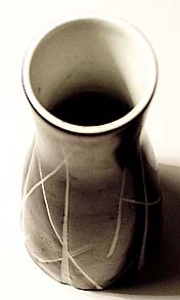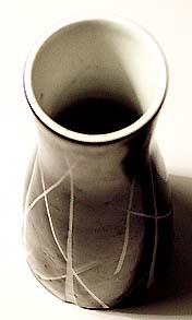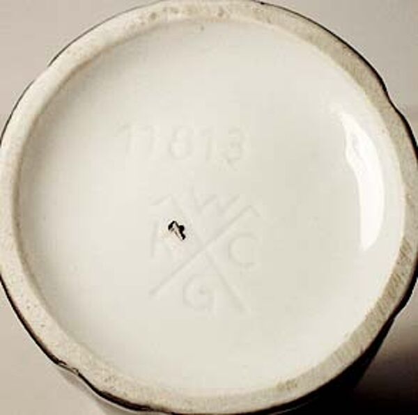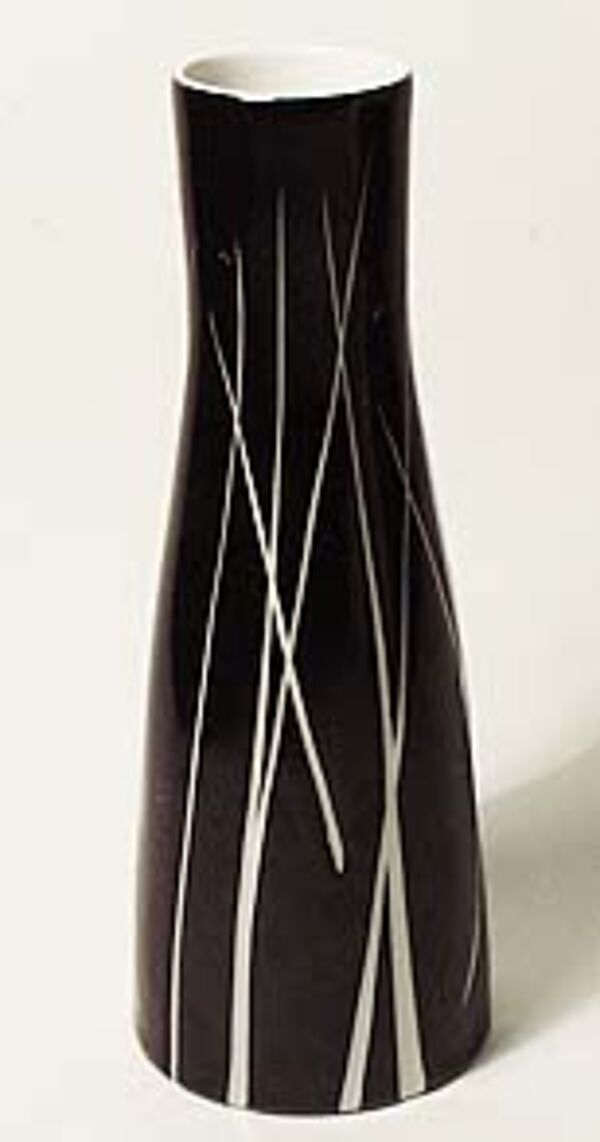 Länglicher, zum Stand sich konisch verbreiternder Korpus mit zylindrisch gestrecktem Halsteil. Weißer Scherben, außenseitig schwarze Glasur, die unregelmäßig angeordnete Streifen ausspart, so dass sich ein abstraktes Dekor ergibt. Höhe ca. 17 cm. Unterseitig gemarkt und gepresste (Form?)Nummer "11813", wohl 1950er, 60er Jahre.