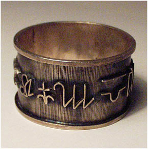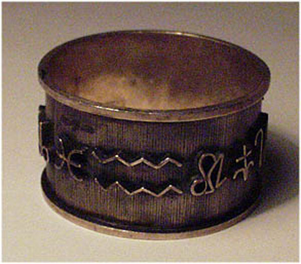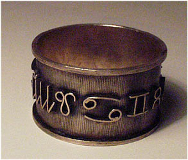 Zylindrischer Silberkorpus (835er), dem äußerlich stilisierte, erhaben ausgearbeitete Tierkreiszeichen aufgesetzt sind. Maße: Durchmesser ca. 4,8 cm, Breite ca. 2,7 cm. Das Silber ist angelaufen, ungeputzter Zustand. Wohl Deutschland oder Skandinavien der 40er bis 60er Jahre.