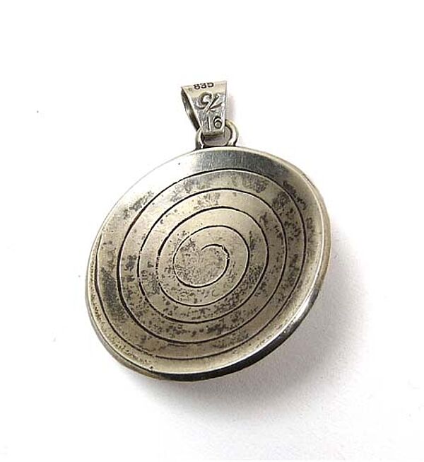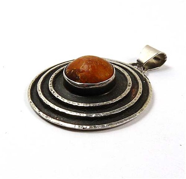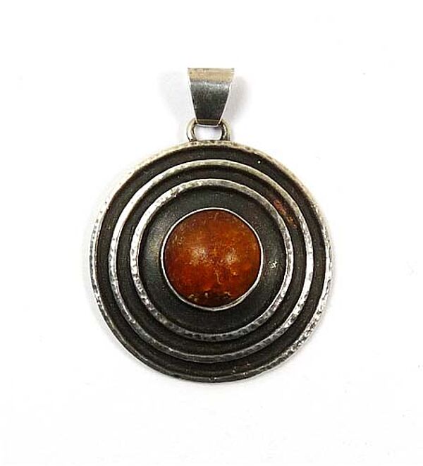 Scheibenförmiger, leicht konvexer, partiell schwarz patinierter Silberkorpus (835er), der mittig einen wohl nur partiell gemugelten, runden, honigfarbenen, opaken Bernstein-Cabochon in Zargenfassung trägt, der von drei konzentrischen, leicht erhabenen Ringelemente umgeben ist. Oberseitig kräftige, agedeutet dreieckig konfigurierte bewegliche Öse. Durchmesser ca. 3,5 cm, Länge mit Öse ca. 4,6 cm. Rückseitig eingelassenes (graviertes?) Spiralelement. An der Öse Markung und Prüf(?)Nr. 16. Wohl 40er, 50er Jahre.