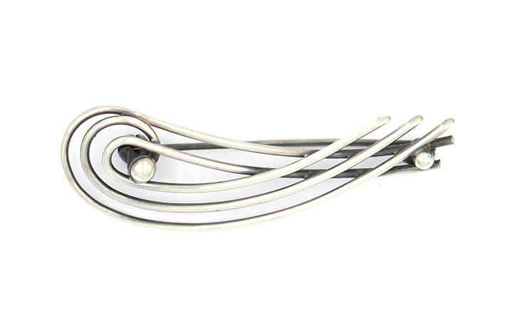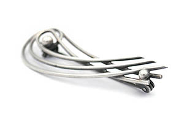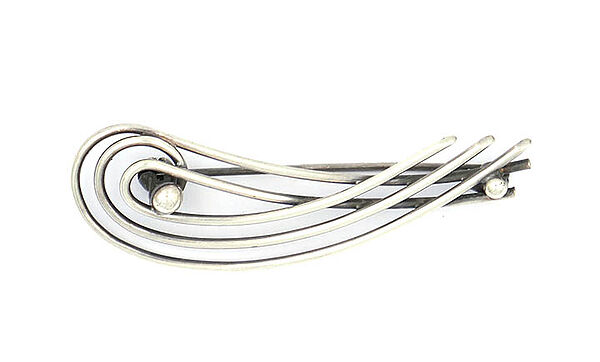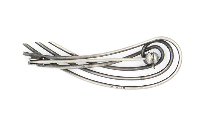 Silber-Korpus (835) aus organisch geschweiften Drähten. Rückseitig Sicherheitsbroschierung mit Kugelkopf. Diskrete Gebrauchsspuren, insgesamt guter bis sehr guter Zustand. Gemarkt, aber ungedeutet. Wohl Deutschland der 40er oder 50er Jahre.