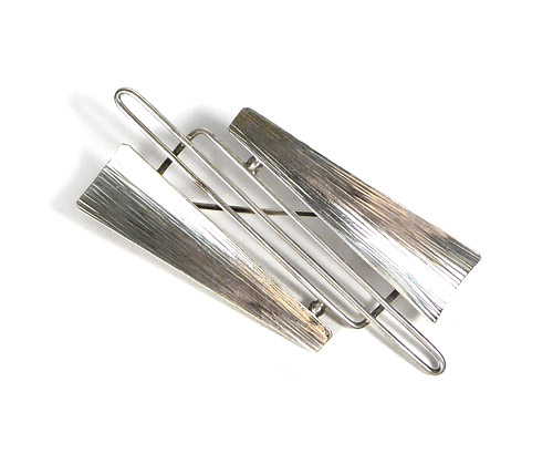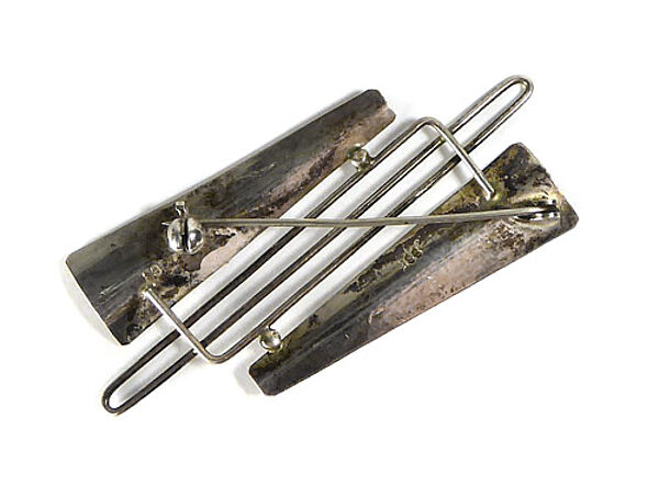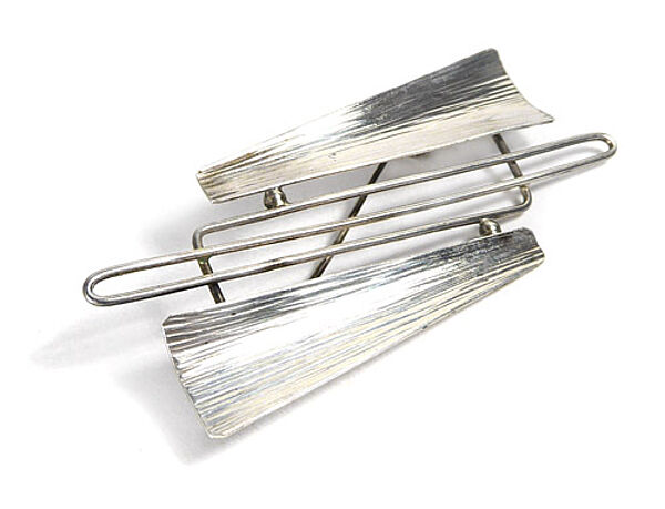 Silberner Korpus (835er), der im Wesentlichen aus zwei seitenverkehrt gespiegelten, sich gegenüberliegenden, leicht gewölbten, viereckigen Elementen besteht, die sich entgegengesetzt verjüngen. Verbunden sind sie mit einem feinen, streng parallel verlaufenden Drahtgeflecht. Länge ca. 6 cm, ungeputzter Zustand mit leichter Patina und geringen Tragespuren. Rückseitig Sicherheitsbroschierung mit Kugelkopf. Ungemarkt, wohl Deutschland der 1950er Jahre. Die Ästhetik der Brosche erinnert ein Stück weit an die Arbeiten von Alexander Calder.