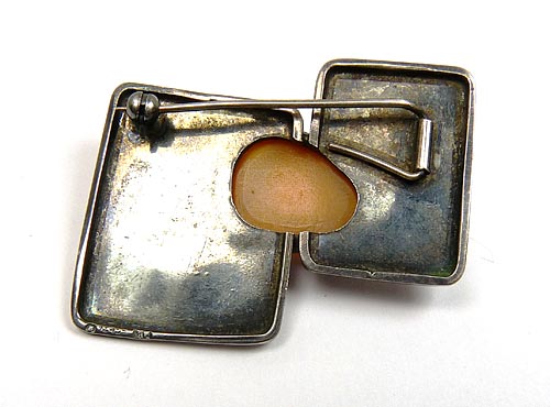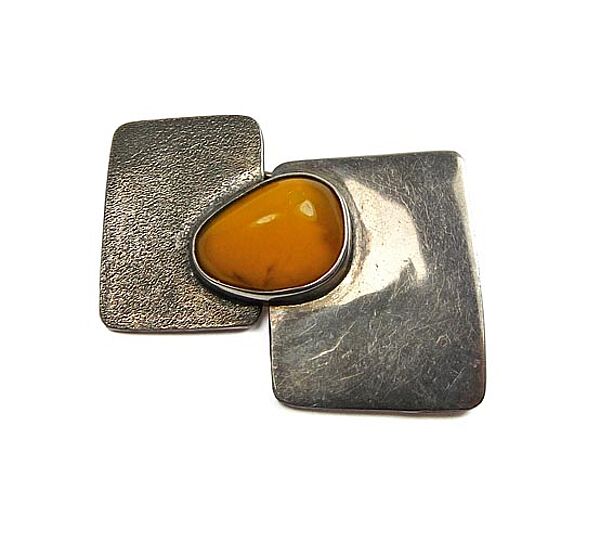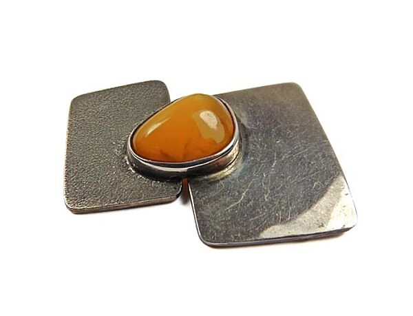 Handgefertigter, rückseitig mittig offen gearbeiteter, silberner Korpus (925er) aus zwei nebeneinander liegenden, zueinander leicht verschobenen, rechteckigen Elementen mit abgerundeten Ecken (eines mit glatter, eines mit fein strukturierter Oberfläche), die durch einen honiggelben, überwiegend opaken, annähernd dreieckig konfigurierten Bernstein-Cabochon in Zargenfassung miteinander verbunden sind. Maße ca. 4,7 x 3,6 cm, ungeputzter Zustand mit leichter Patina und geringen Tragespuren. Rückseitig Sicherheitsbroschierung mit Kugelkopf, ungedeutete Markung und Punzierung (Frauenkopf nach rechts im Oval, leider ohne weitere Zeichen. Formal käme also ein polnischer, russischer oder ungarischer Hersteller in Frage, wobei erstere beiden wahrscheinlicher sein dürften). Vermutlich 40er, 50er Jahre.