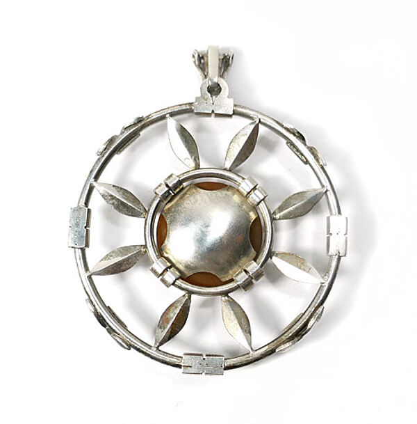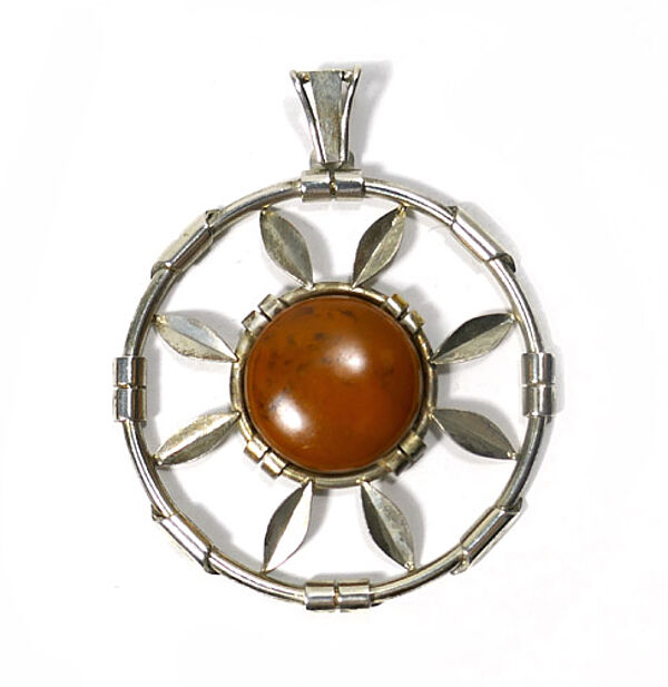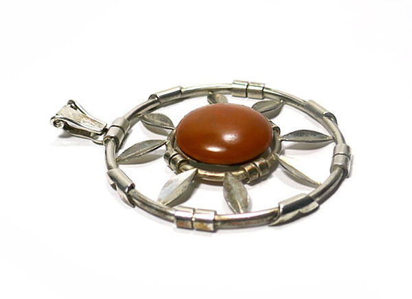 Handgearbeiteter Silberkorpus (geprüft) in Form einer Blüte oder eines Rades, wobei die Speichen dann durch stilisierte Blattelemente wiedergegeben sind. Mittig ist ein opaker, orange-brauner Bernstein-Cabochon in Zargenfassung integriert. Oberseitig beweglicher Öse. Länge mit Öse ca. 5,3 cm, Durchmesser ca. 4,2 cm, Durchmesser des Bernsteins ca. 1,8 cm. Ungeputzter Zustand mit minimaler Patina und geringen Tragespuren. Ungemarkt, wohl Deutschland der 1930er bis 50er Jahre.