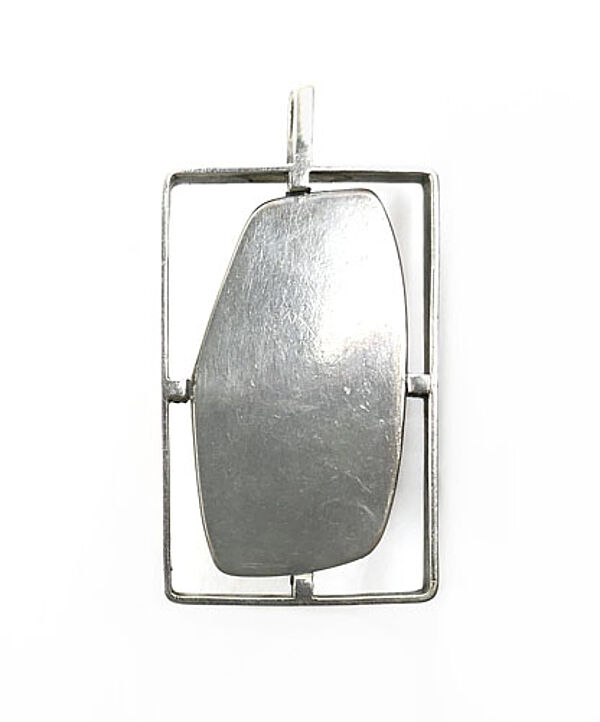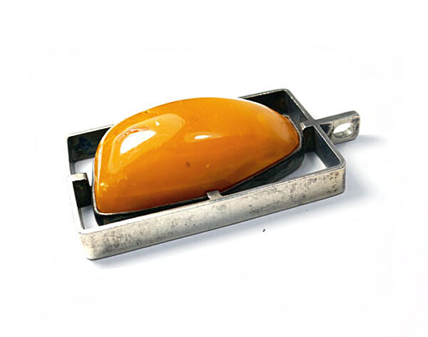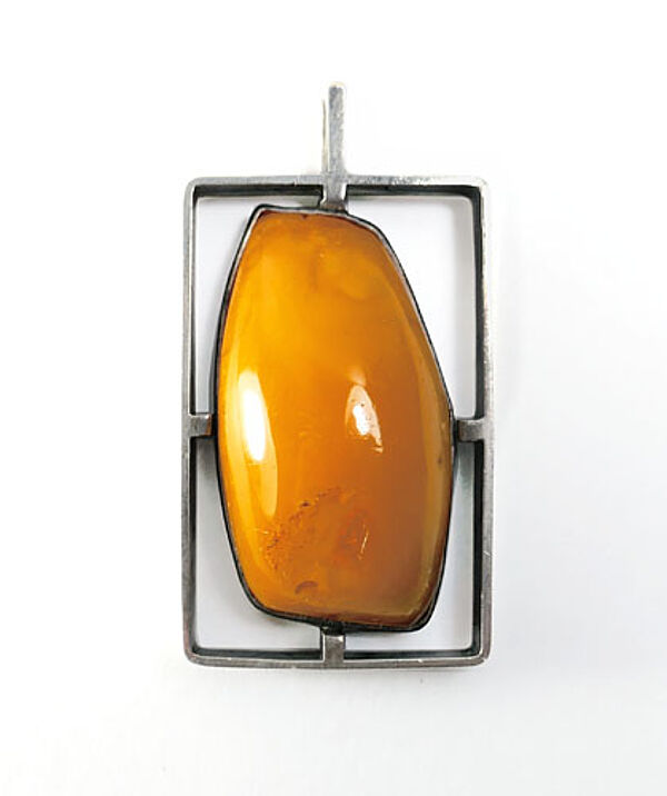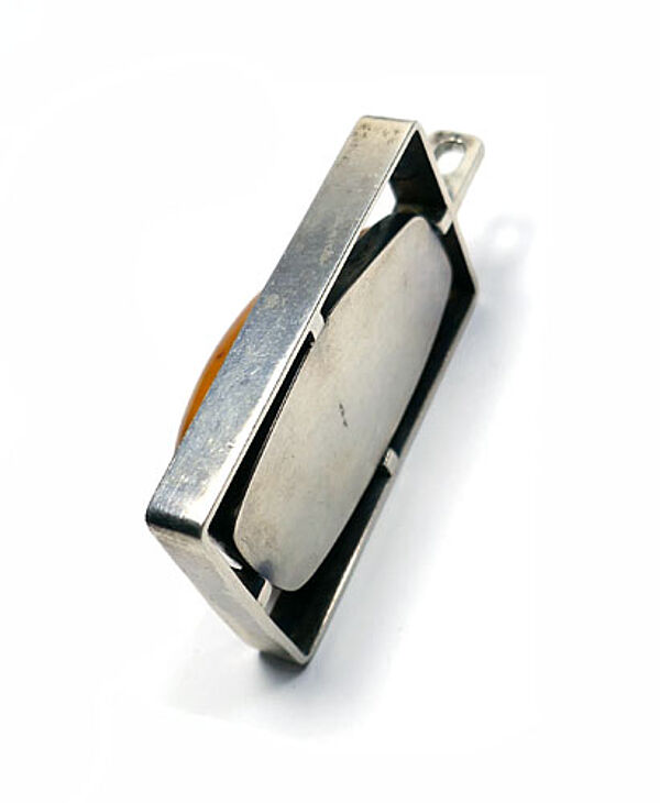 Offen gearbeiteter Silberkorpus (835er): in einem hochrechteckigen Rahmen wird über 4 Stege ein orange-brauner, opaker, gemuggelter Bernstein-Cabochon in Zargenfassung fixiert. Oberseitig starre Öse. Maße ca. 5 x 3 cm, Länge mit Öse ca. 5,7 cm, ungeputzter Zustand mit leichter Patina und geringen Tragespuren (so zeigen sich vereinzelt Flohbisse an der Steinoberfläche). Ungemarkt, wohl Deutschland oder Baltikum der 1940er bis 60er Jahre.