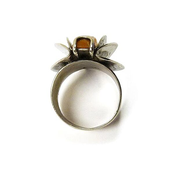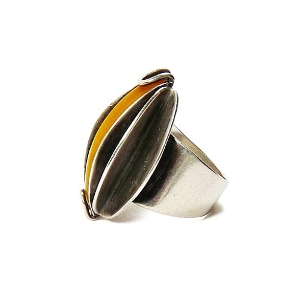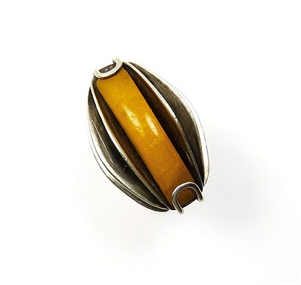 Silbener Ring (835er) mit kräftiger, sich im Verlauf verbreitender Schiene. Fächerartig aufgebauter Ringkopf, der mittig einen länglichen, segmentartig gemugelten, hell-orangefarbenen, opaken Bernstein trägt. Dieser wird von zwei schlaufenartigen Krappen gefasst. Ringinnendurchmesser ca. 16 mm. Länge des Kopfes ca. 3 cm, ungeputzter Zustand mit unterschiedlicher Patina und moderaten Trage- insbesondere leichten Kratzspuren am Bernstein. Innenseitig Markung (ligiertes "AT", ungedeutet), wohl Deutschland der 50er, 60er Jahre.