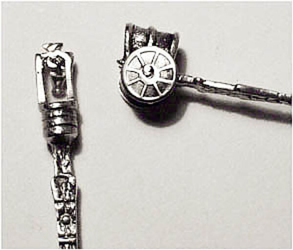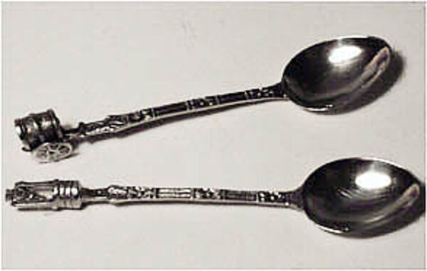 Löffelkorpus jeweils aus Silber (925er) mit einer Länge von ca. 9,7 cm, das Ende des Löffelstiels ist plastisch ausgearbeitet, einmal in Form eines Planwagens mit drehbaren Rädern, einmal in Form eines Ziehbrunnens mit abgehängtem, beweglichem Eimer. Ungeputzter Zustand mit geringen Gebrauchsspuren. Gemarkt: