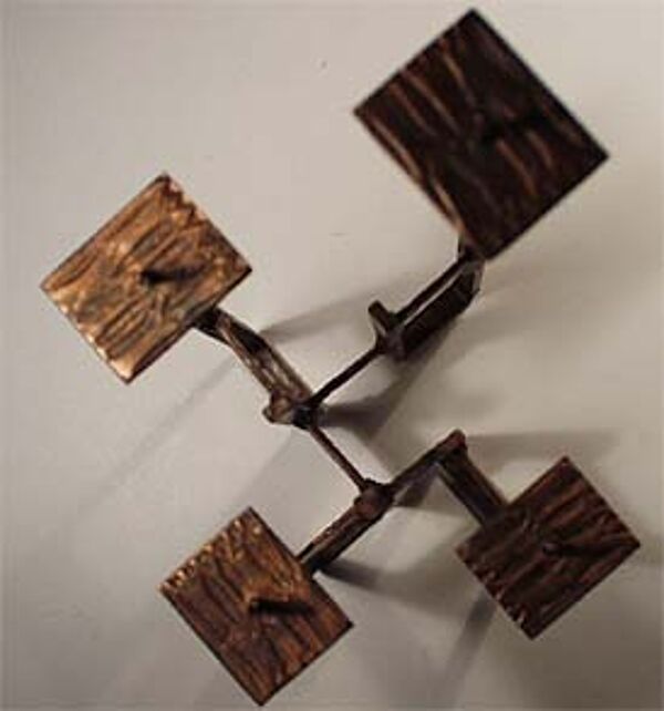 4-armiger asymmetrischer Kupferkorpus mit einer max. Höhe von ca. 31 cm. Oberfläche riefig strukturiert. Ungemarkt, aber ein vergleichbarer Leuchter ist abgebildet in "Kunsthandwerk in der Deutschen Demokratischen Republik" von Walter Funkat, Verlag der Nation Berlin 1970, siehe hier S. 323. Der Leuchter dürfte in den 1960er Jahren entstanden sein.