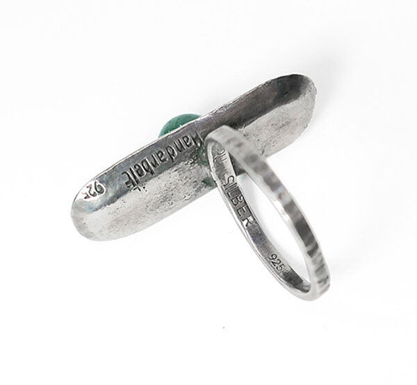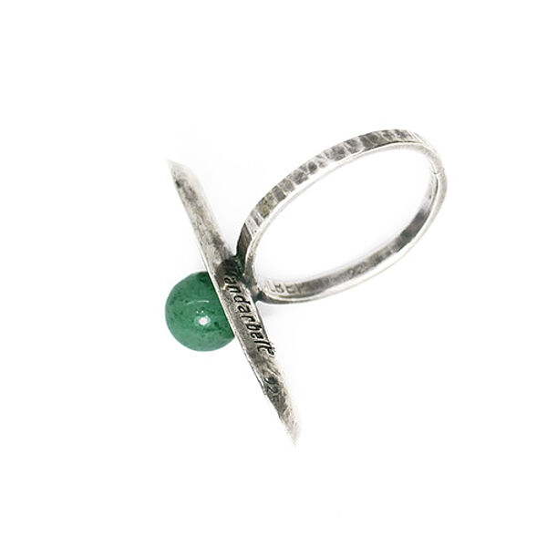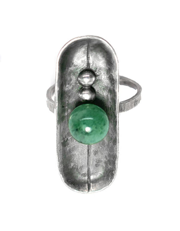 Silberner Korpus (925er), bestehend aus schmaler Ringschiene und dominantem, handgetriebenem, länglich-schalenförmigen Kopf, dem mittig eine grüne Schmucksteinperle (Aventurin?) aufgesetzt ist sowie auf einer Seite noch zwei kleine, silberne Halbkugelelemente. Maße des Ringkopfes ca. 3 x 1 cm, Ringdurchmesser ca. 18 mm, ungeputzter Zustand mit partiell dunkler Patina und geringen Tragespuren. Am Ringkopf rückseitig bezeichnet "HANDARBEIT", wohl Deutschland der 1960er, 70er Jahre.