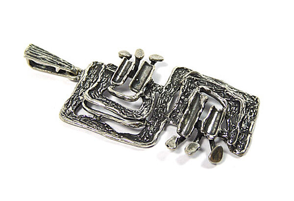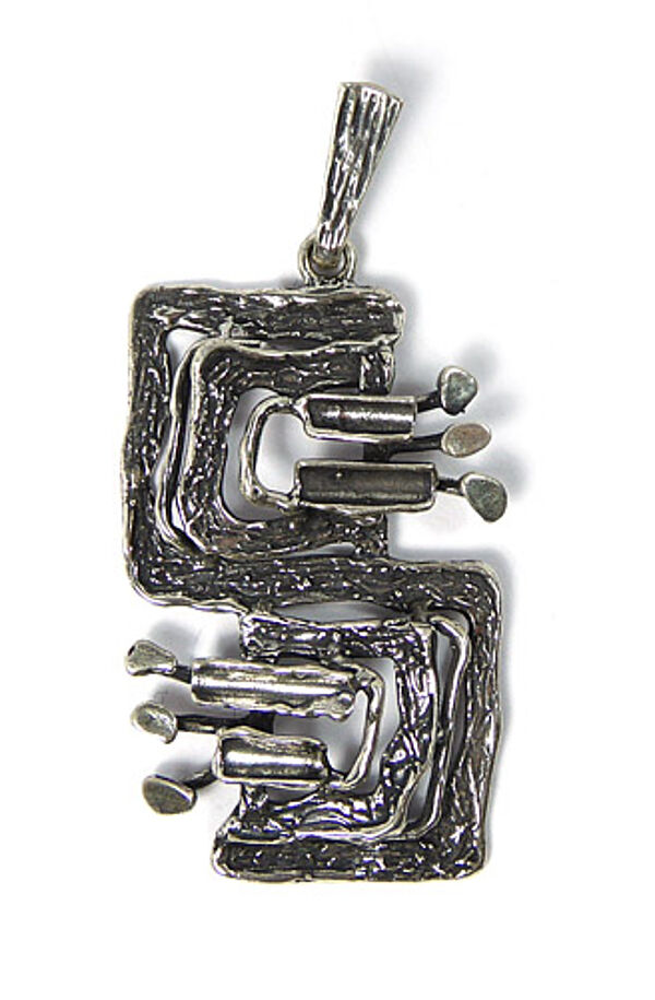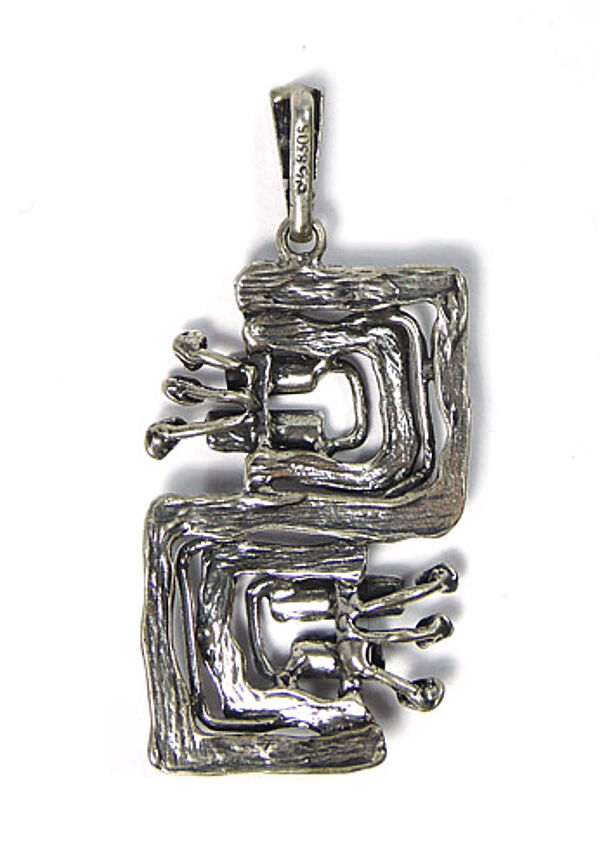 Komplexer, annähernd S-förmiger Silberkorpus (830er) der durch unregelmäßig verlaufende Bänder u.a. Elemente gebildet wird. Oberseitig einfache, bewegliche Öse. Maße 4,2 x 2,8 cm, Länge mit Öse ca. 5,6 cm, ungeputzter Zustand mit dunkler Patina und geringen Tragespuren. Ungedeutete Markung, wohl Skandinavien der 1960er, 70er Jahre.