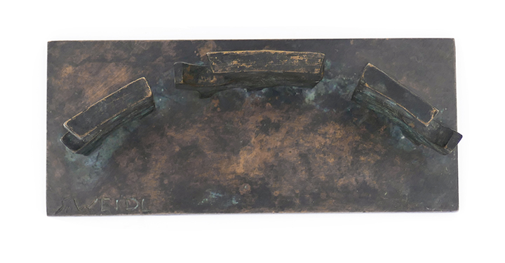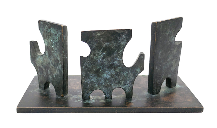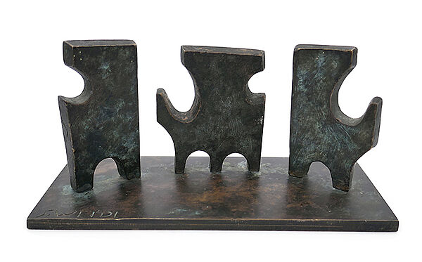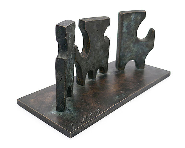 Braun patinierter, vollplastischer Bronzekorpus, drei korrespondierende gefußte, abstrakte Elemente darstellend, die auf einer großen Plinthe mit Schrauben befestigt sind, auf dieser signiert. Plinthenmaße ca. 17 x 7,2 cm, Höhe ca. 7 cm, geringe Altersspuren. Wohl 1950er, 60er Jahre.