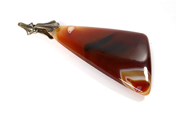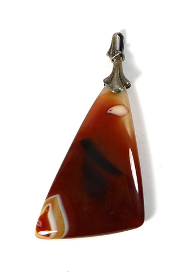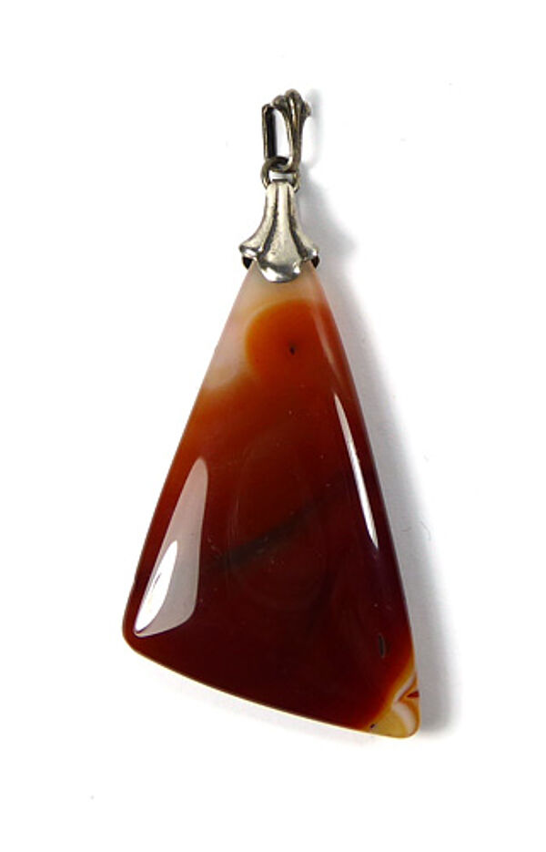 Der Korpus wird dominiert durch einen dreieckig geschliffenen, bräunlich-beigen Lagenachat mit abgerundeten Ecken. Oberseitig bewegliche Silberöse (835er) in Form zweier untereinander liegender, stilisierter dreifinger Blätter. Länge mit Öse ca. 7 cm, ungeputzter Zustand mit leichter Patina und diskreten Tragespuren. Ungemarkt, wohl Deutschland der 1920er, 30er Jahre.