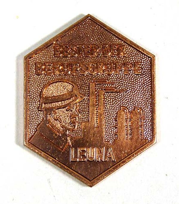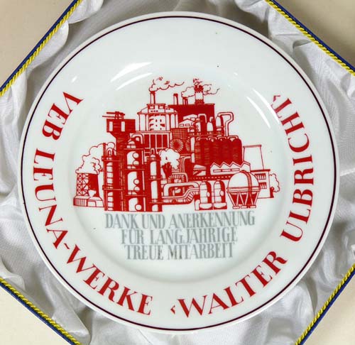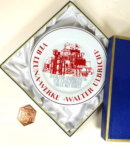 Teller mit leicht stilisierter Darstellung der Leuna-Werke in Rot, darunter bezeichnet "Dank und Anerkennung für langjährige treue Mitarbeit" in Hellgrau sowie im Randbereich "VEB Leuna-Werke Walter Ulbricht" in Rot. Durchmesser ca. 19,3 cm, makelloser Zustand. Unterseitig gemarkt, wohl 70er Jahre. Der Teller befindet sich im originalen quadratischen Präsentkarton in Blau mit goldener Kante (Maße ca. 23,5 x 23,5 x 3,5 cm), der innen mit weißer Kunstseide ausgeschlagen ist. Er weist außenseitig leichte Gebrauchsspuren auf, so haben sich teilweise die Ecken gelöst. Beiliegend die dazu gehörige sechseckige Bronze-Plakette, die den Kopf eines behelmten Arbeiters im Profil nach rechts zeigt, im Hintergrund die stilisierte Darstellung des Werkes. Maximale Abmessung ca. 5,2 cm, minimale Abmessung ca. 4 cm, makelloser Zustand.